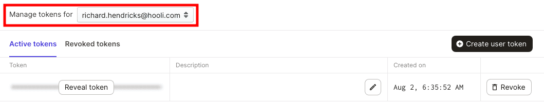 To manage tokens for another user, select the user from the Manage tokens for dropdown: